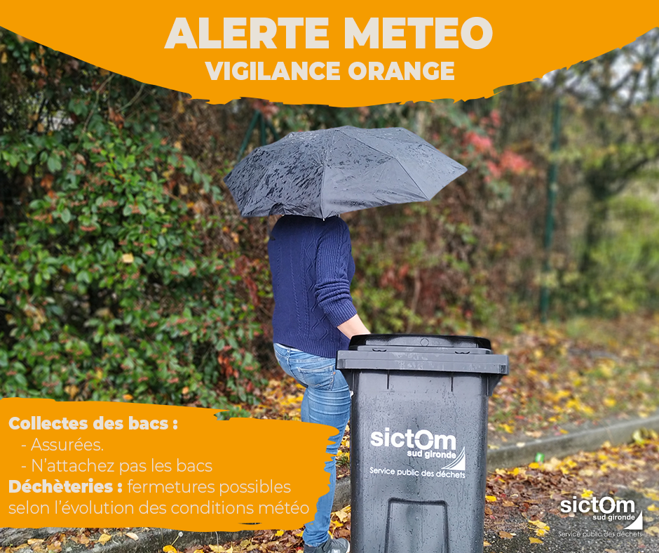Les Services du Sictom du Sud-Gironde restent joignables au 05 56 62 36 03. Privilégiez votre venue sur nos sites dès que la vigilance orange sera levée.