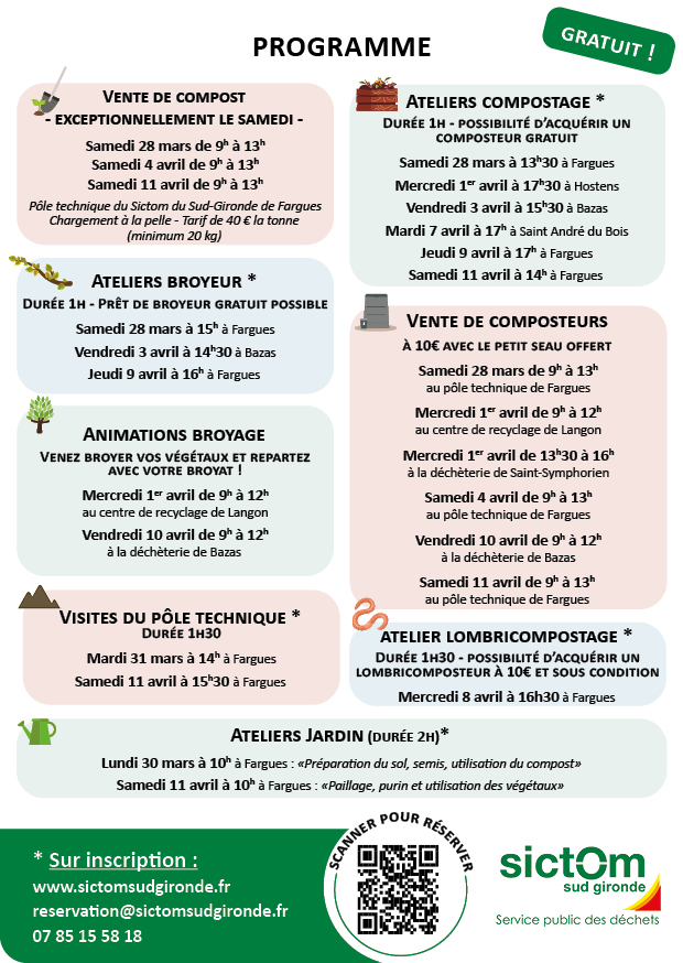 Au programme, vente de compost, atelier compostage (avec la possibilité de repartir avec un composteur gratuit), ateliers broyeurs (indispensable pour réserver gratuitement le broyeur du Sictom), ateliers jardin (pour les petits et les grands), visites du pôle technique… autant d’évènements pour réduire ses biodéchets !