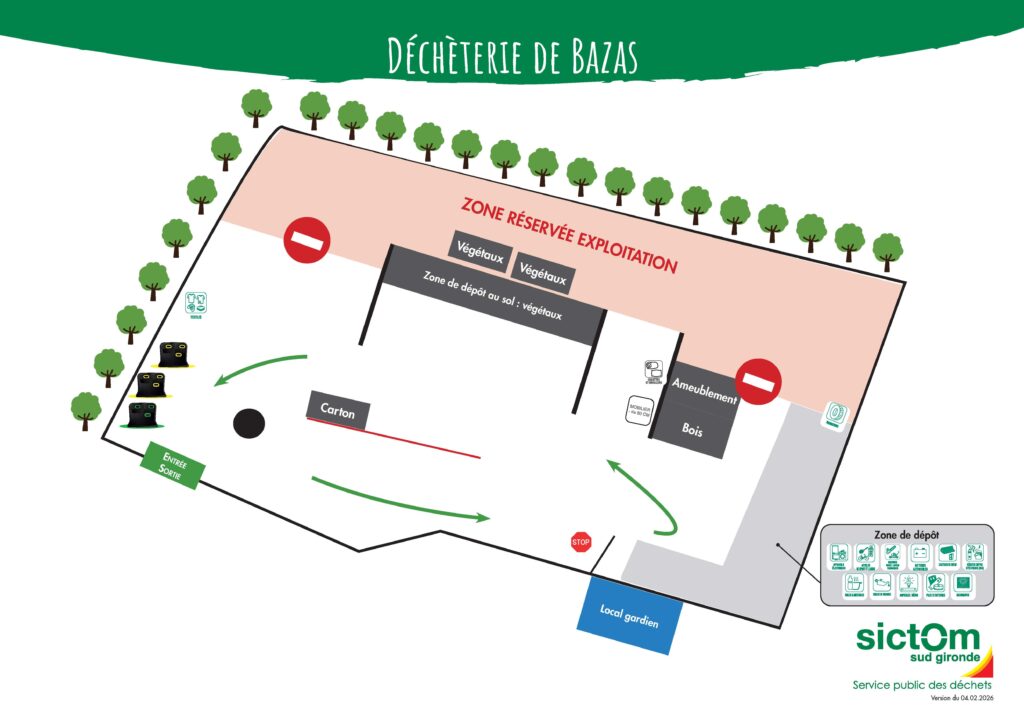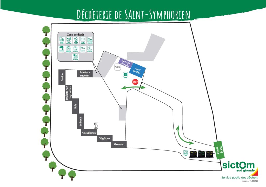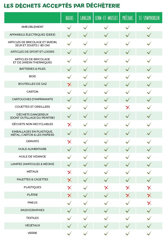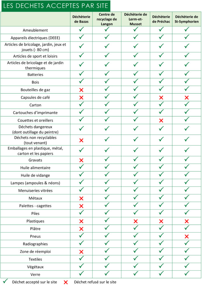 Le territoire du Sictom du Sud-Gironde dispose d’un Centre de recyclage et de 4 déchèteries. Différents types de déchets sont acceptés sur chaque site.